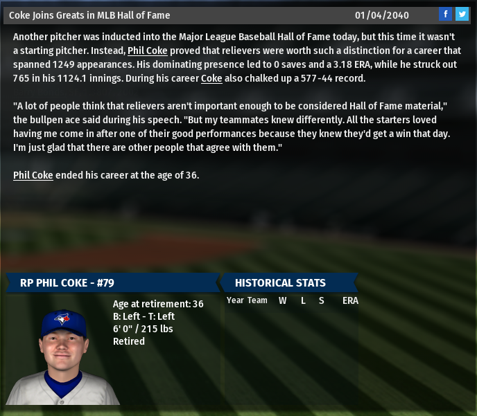 It turns out the answer is somewhere in the middle. Coke received 65.3% of the vote his first year on the ballot, the first man out of a class that included Manny Machado, Carlos Correa, and Alex Claudio. The next year he was a little closer with 67.1%. Then finally, in his third year on the ballot, Phil Coke got the call. Receiving 83.4% of the vote, he was the one and only member of the Hall of Fame class of 2040. On that stage in Cooperstown, Phil Coke will stand alone, much like he had for his entire career. In typical OOTP fashion, the announcement made no sense: