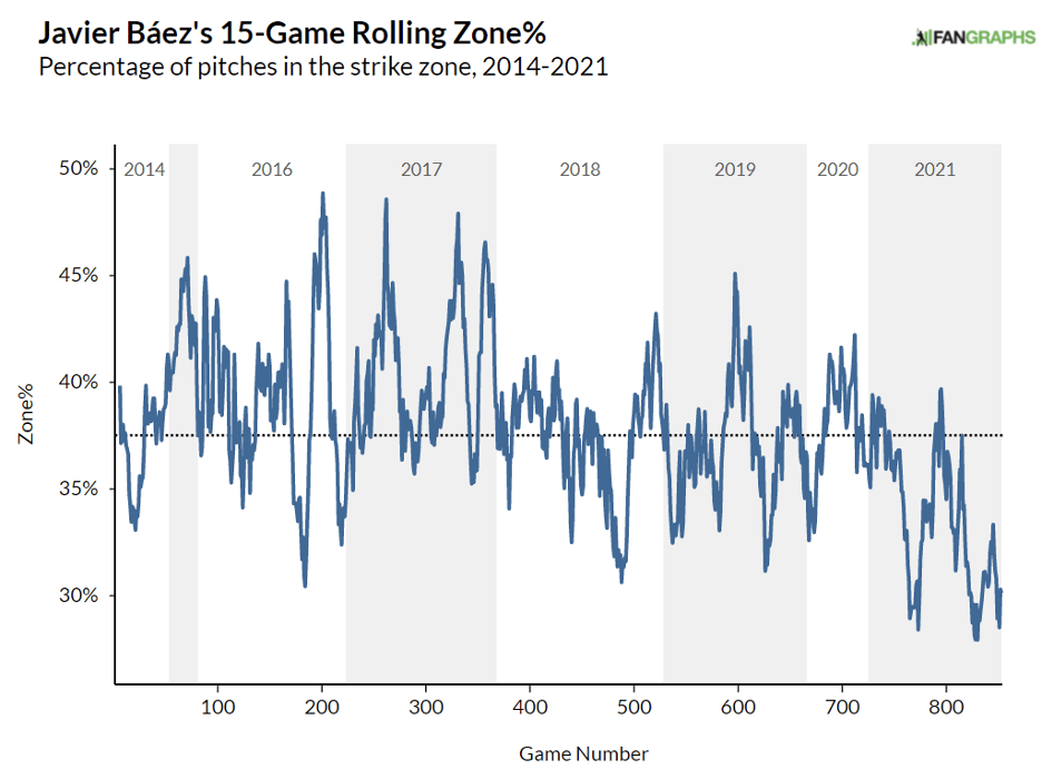 Pitchers are increasingly inclined to throw Báez a consistent diet of pitches outside the strike zone. This year, Báez has seen just 39.2% of pitches in the strike zone, the lowest figure of any player in the Statcast era.