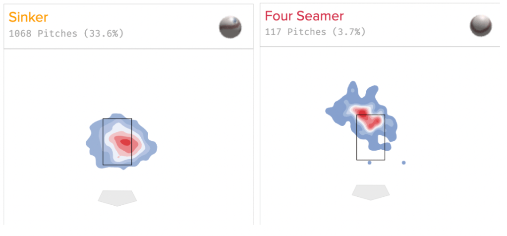 Above, you see the heat maps (by Baseball Savant) for his four-seam fastball and cutter, a high-speed pair of pitches he uses two-thirds of the time. Wentz is simply all over the heart of the zone. Considering he doesn’t throw an above-average-velocity fastball, these maps are a clear cause for concern. As a point of comparison, below you will see heat maps for wildly-successful low-velocity pitcher Logan Webb.